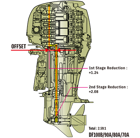 This system which incorporates the Offset Driveshaft features a first stage reduction between the crankshaft and drive shaft and a second stage reduction inside the gear case. This design makes a larger gear ratio possible, allowing it to turn a large diameter propeller for high propulsive efficiency while providing higher torque.