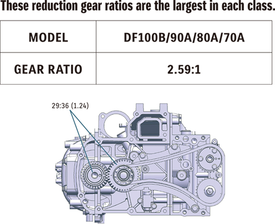 Thanks to the powerful torque delivered with Suzuki’s two-stage gear reduction, these outboards can turn a large diameter propeller. Suzuki engineered a new highly efficient propeller that takes advantage of this torque to provide faster acceleration and higher top speed.