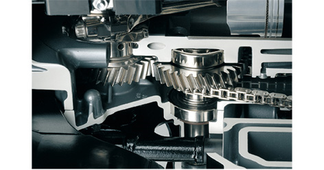 The timing chain runs in an oil-bath so it never needs lubricating, and is equipped with an automatic hydraulic tensioner so it remains properly adjusted at all times.